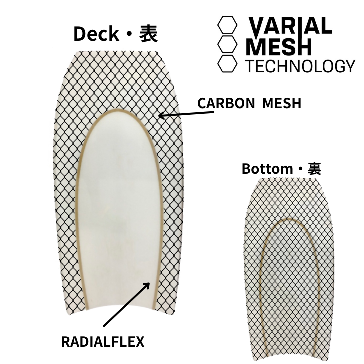 デッキ側にメッシュを入れる事によりボードの張りを高めボトム側には 全面メッシュを入れターン時の捻じれ反発を高めるテクノロジー。